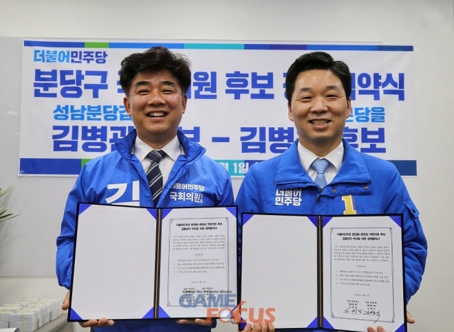 김병관 더불어민주당 후보(분당갑)가 김병욱 후보(분당을)와 지난 2일 21대 총선 공통공약 정책협약식을 열고, 분당판교의 발전과 주민의 삶의 질 향상을 위해 노력하겠다고 밝혔다.