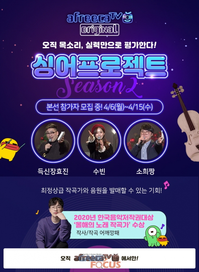 아프리카TV는 이달 15일(수)까지 '싱어프로젝트 시즌2' 4월 참가자를 모집한다고 밝혔다.