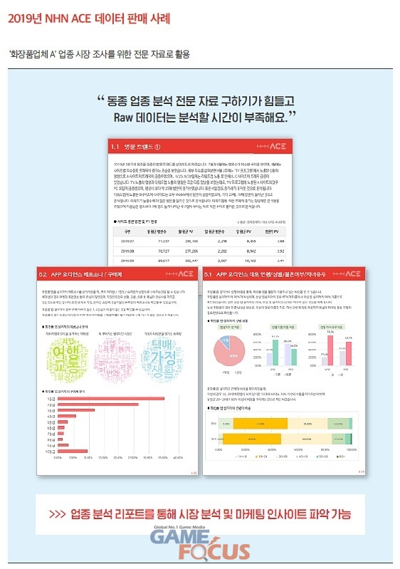 이번 사업에서 NHN ACE는 업종별 웹사이트 방문자들의 행동, 특성과 관련해 안전하게 비식별 조치된 데이터를 맞춤 판매한다. 수요 기업은 동종 업종 소비자들의 유입 경로와 구매 정보, 관심사 등을 파악해 마케팅이나 상품 기획에 활용할 수 있다. 특정 업종의 시장 트렌드를 분석한 리포트 형태로도 구매 가능하다.