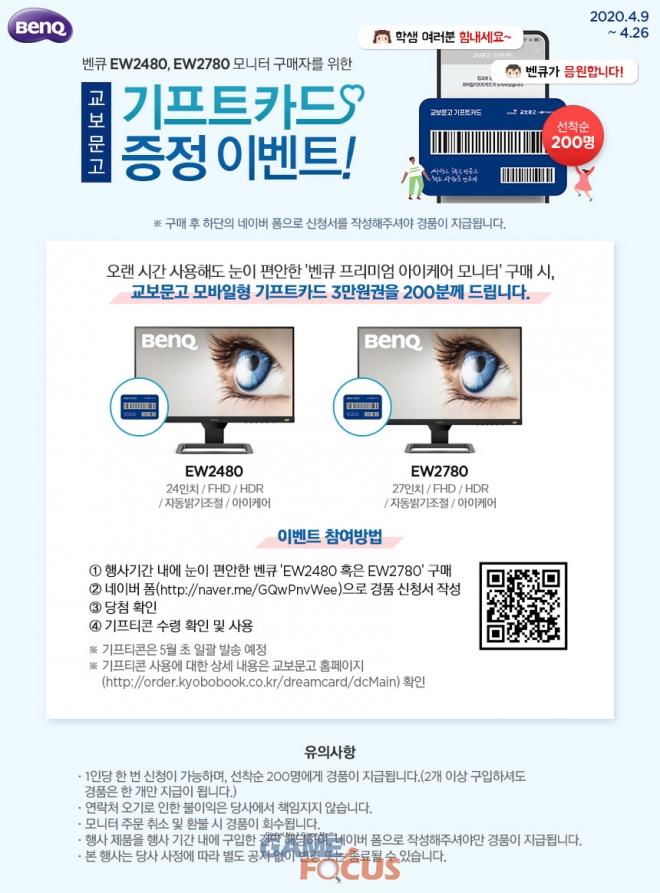 벤큐코리아 마케팅팀 이상현 팀장은 “최근 재택근무 및 온라인 학습이 일상이 되면서 오랜 시간 사용해도 눈이 편안한 모니터를 찾는 분들이 많아졌다. 벤큐 프리미엄 아이케어 EW2480, EW2780 제품은 업무나 학습할 때 뿐 아니라 일반 모니터보다 빠른 75Hz 주사율과 HDR을 지원해 게임과 영상 감상에도 적합하다.”며, “어려운 시기를 집에서 잘 견디고 있는 학생들을 응원하기 위해 온라인 개학을 맞아 학습 서적이나 평소 읽고 싶었던 책을 구입할 수 있도록 교보문고 모바일형 기프트카드(3만원)도 함께 준비했으니 많은 관심 부탁드린다.”고 전했다.