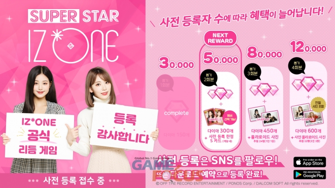 2020년 봄, 한국과 일본에서 출시되는 'SUPERSTAR IZ*ONE'의 사전등록자 수가 3만 명을 달성하였습니다. 달성 기념으로 게임 내에서 이용 가능한 다이아 (150개) 가 유저 전원에게 지급된다. 그리고 등록자 수에 따라 달성 보상이 추가되며, 5만 명 돌파 시에는 최애 멤버를 골라 받을 수 있는 사전 등록 한정 S카드가 지급될 예정이다.
