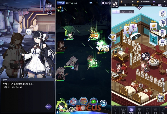 '야생소녀'의 전투는 턴제로 구성되어 있으며, 유저들은 아니마들이 소유한 다양한 스킬을 활용하여 전략을 수립할 수 있다. 전투 외에도 마이룸, 아레나, 던전, 실험실, 원정대, 길드 등의 다양한 콘테츠가 유저를 만날 준비를 완료했다.