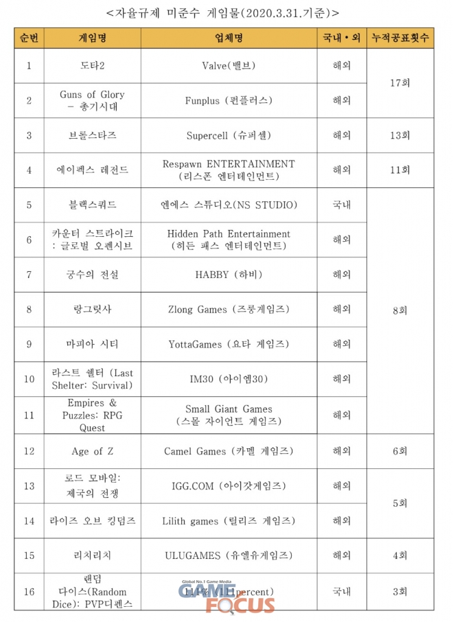 한국게임정책자율기구(이하 ‘기구’)는 한국게임산업협회(이하 ‘협회’)에서 시행하고 있는 강화된 “건강한 게임문화 조성을 위한 자율규제 강령(이하 ‘강령’)”에 따라 미준수 게임물을 2020년 4월 13일 17차 공표하였다.