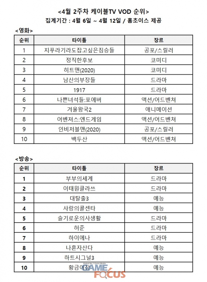 홈초이스가 발표한 '4월 2주차 케이블TV 영화 · 방송 VOD 순위'에 따르면, '지푸라기라도 잡고 싶은 짐승들'이 영화 VOD 순위 1위를 차지했다.