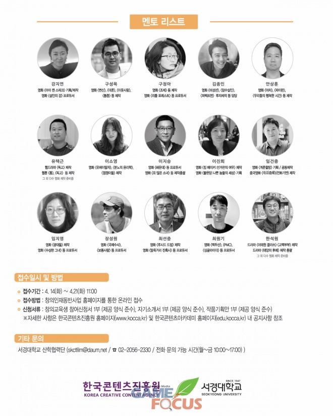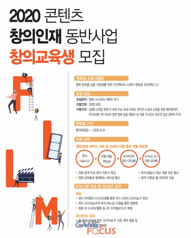 금번에 실시되는 콘텐츠 창의인재동반사업에는 영화 '백두산', '암수살인', '불한당: 나쁜 놈들의 세상', '아이 캔 스피크', '변신', '리틀 포레스트', '수상한 그녀'등 흥행 영화의 실력있는 제작자와 프로듀서 군단이 멘토로 참여한다. 선발된 교육생에게는 월 120만 원의 창작지원금과 시나리오 기획, 개발, 멘토링, 투자/배급사 피칭행사, 워크샵, 오픈특강 등 다양한 교육 프로그램이 제공될 예정이다.