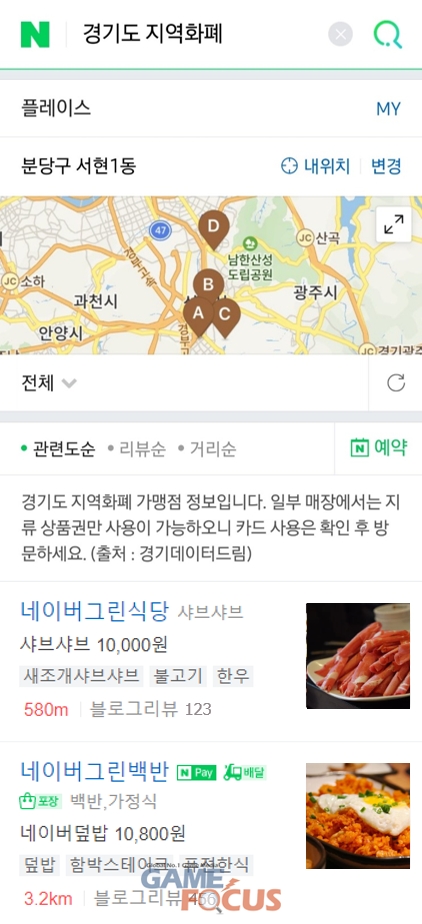이용자들은 네이버 PC와 앱, 네이버지도 앱에서 ‘경기도 지역화폐’를 검색하면, 식당·할인마트·카페 등 다양한 지역화폐 사용처를 간편하게 확인할 수 있다.