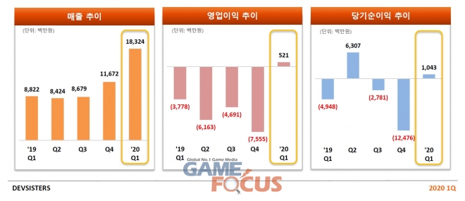 데브시스터즈는 2020년 1분기 매출액 183억원, 영업이익 5억원, 당기순이익 10억원을 기록했다. 매출의 경우 지난 분기 대비 57% 증가하며 2014년 상장 이래 분기 최대 매출의 기록을 경신했고, 그에 힘입어 영업이익 및 당기순이익도 흑자로 돌아섰다.