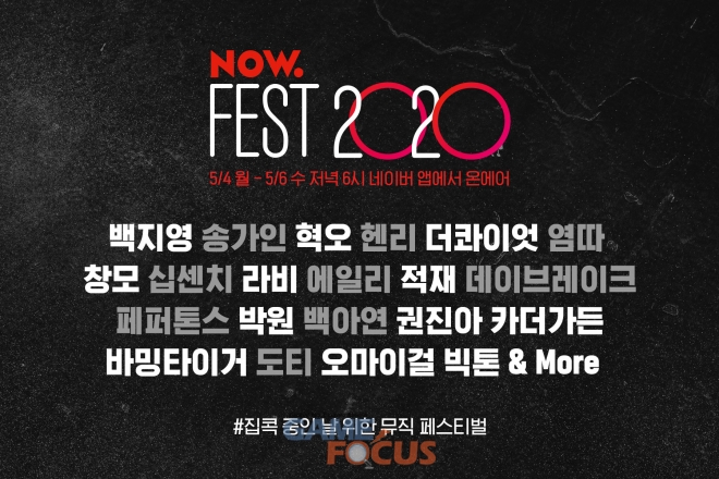 모바일 네이버 첫화면에 위치한 'NOW'를 통해 즐길 수 있는 'NOW FEST 2020'은 오는 5월 4일부터 6일까지 3일동안 오후 6시부터 진행된다. 백지영, 혁오, 송가인 등 다양한 장르에서 활동하는 30여 명의 아티스트들이 생생한 라이브 공연을 선사할 예정이다.