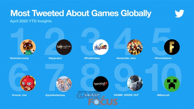 1월부터 4월 22일까지 트위터에서 가장 많이 언급된 게임 순위도 함께 공개됐다. 1위는 출시와 동시에 선풍적인 인기를 끌고 있는 닌텐도의 동물의 숲(Animal Crossing, @animalcrossing)이 올랐다. 동물의 숲은 지난달 출시 이후 260만 건의 언급량을 기록했다. 이는 2위에 오른 '페이트/그랜드 오더(Fate/Grand Order, @fgoproject)'의 언급량보다 2배 이상 많은 수치다.