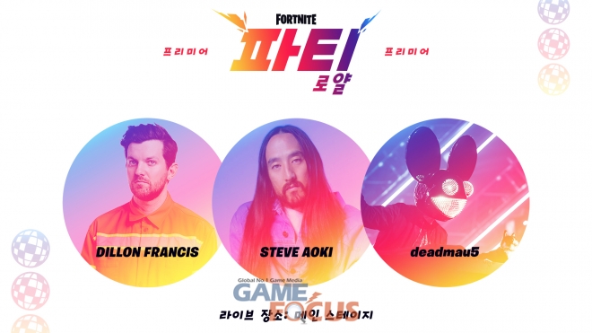 한편, 에픽게임즈는 '파티로얄' 출시를 기념해 프리미어 이벤트를 진행한다. 메인 스테이지에서 진행되는 이번 이벤트는 방탄소년단과의 콜라보레이션으로도 유명한 DJ 겸 프로듀서 스티브 아오키(Steve Aoki)와 역시 DJ와 프로듀서로 유명한 딜런 프란시스(Dillon Francis), 캐나다 출신의 유명 프로듀서이자 뮤지션인 데드마우스(deadmau5) 등이 출연하며, 특히 스티브 아오키는 방탄소년단과 협업한 작품인 'MIC Drop'을 이번 공연에서 선보일 예정이다.