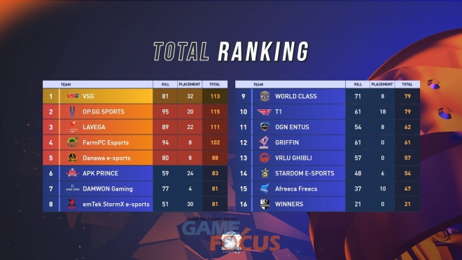 VSG와 우승 경쟁을 펼친 OP.GG SPORTS(오피지지 스포츠)는 킬 포인트 95점과 순위 포인트 20점으로 2위를, 마지막 매치에서 치킨을 획득한 LAVEGA(라베가)는 극적으로 3위를 차지했다.