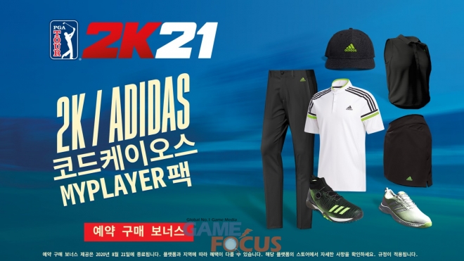 PGA TOUR 2K21는 지금부터 예약 구매할 수 있으며, 예약 구매 특전으로2K와 아디다스의 파트너십으로 제작된 코드케이오스 MyPLAYER 팩을 받게 된다. 이 특전은PGA TOUR 2K21 전용으로 디자인된 폴로, Ultimate365 바지 및 TOUR 모자와 코드케이오스 보아(CODECHAOS BOA) 골프 신발 및 커스텀 장비를 포함한다.