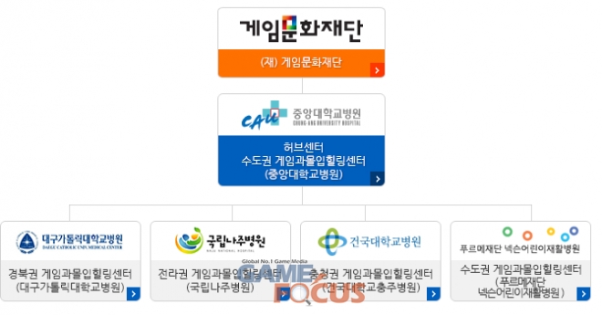 (재)게임문화재단은 2014년 중앙대학교병원(허브센터)과 대구가톨릭대학교병원(경북권), 국립나주병원(전라권), 건국대학교충주병원(충청권), 푸르메재단 넥슨어린이재활병원(수도권) 등 전국 5개 병원을 게임과몰입 전문 지정병원으로 선정하고 협약을 통해 게임과몰입힐링센터를 운영하고 있다.