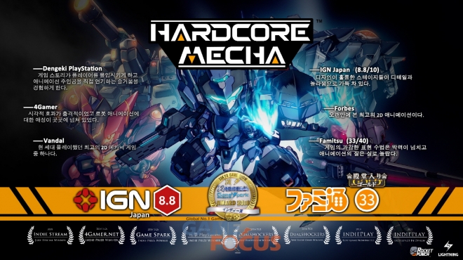 '하드코어 메카'는 메카닉 액션의 진수를 선보이며 전 세계적으로 주목을 받았다. 전 세계 각국에서 인디게임 대상 등을 비롯한 다양한 상들을 휩쓸었으며, 일본에 출시한 이후, IGN 평점 8.8점(10점 만점), 일본 최대 게임 매거진 패미통(Famitsu) 평점 33점(40점 만점) 등으로 높은 점수를 기록하며 게임성을 인정받았다. 또한, 킥스타터(KICKSTARTER, 미국의 크라우펀딩 사이트)에서는 약 1억 6천만 원을 모으며 화제를 끌기도 했다.