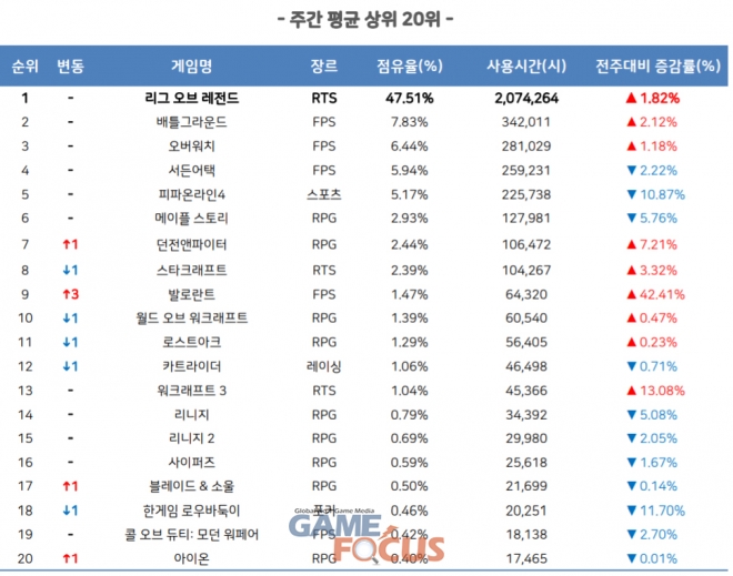 이어 '발로란트'가 전주 대비42.41% 크게 증가한 사용시간으로 점유율 1.47%를 기록하며 3단계 상승한 9위에 랭크되었다.
