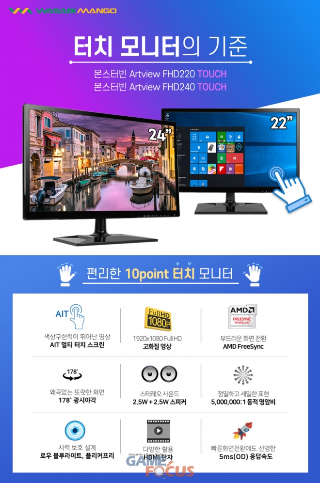 (주)와사비망고(대표이사김환준)는 터치모니터 신제품 '몬스터빈 Artview FHD220 TOUCH'와 '몬스터빈 Artview FHD240 TOUCH'를 발표했다.