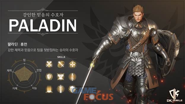 ‘팔라딘’은 ‘DK모바일’ 5종의 클래스 중 가장 강한 체력과 방어에 특화된 스킬을 바탕으로, 공격과 방어에 모두 뛰어난 전천후 캐릭터다. 또한, ‘발트섬’을 배경으로 제작된 동영상을 통해 게임의 배경 분위기를 미리 살펴 볼 수 있다. 초보자 지역을 제외한 모든 필드를 로딩 없이 즉시 이동 가능한 심리스 방식으로 구현했다. 이로써 채널 구분 없는 오픈 월드에서 대규모 전투 및 공성전 등 다양한 형태의 PVP(이용자 간의 전투)가 가능하다는 것이 회사측 설명이다.