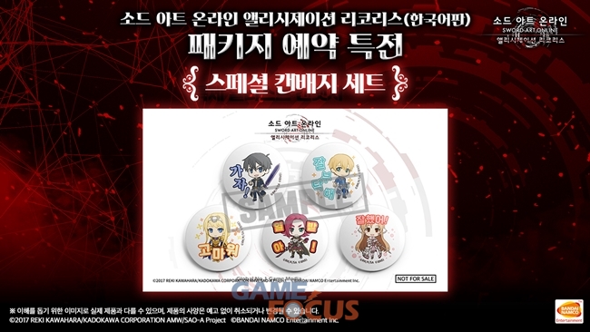 플레이스테이션4용 '소드 아트 온라인 앨리시제이션 리코리스'(한국어판) 패키지 버전의 예약판매는 6월 25일부터 시작된다. 패키지 버전의 예약 구매자를 대상으로 본 작품의 주요 등장 인물을 SD 캐릭터로 표현한 '스페셜 캔배지 세트'를 증정한다.