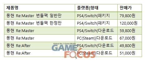 '몽현 Re:Master 번들팩' 패키지는 PS4와 Switch로 일반판 79,800원, 한정판 120,000원으로 각각 발매된다. 또한, '몽현 Re:Master'와 '몽현 Re:After'는 다운로드 버전은 각각 PC(Steam), PlayStation™Store(PS4), 그리고 Switch eShop(Switch)로 개별 출시될 예정이다.