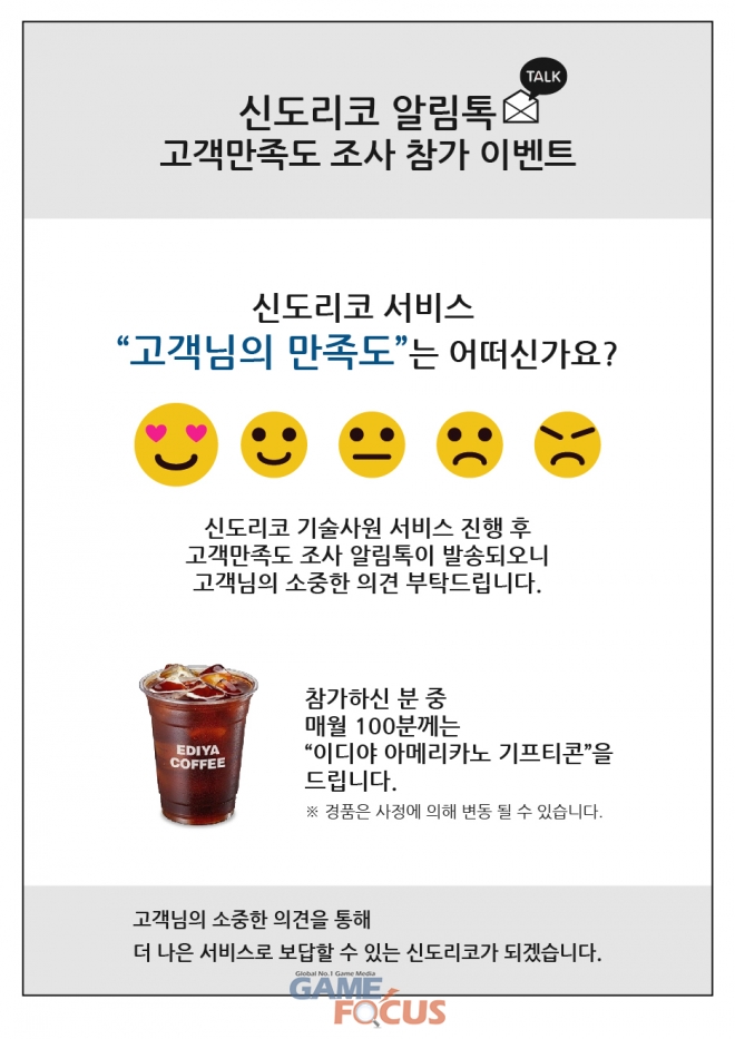 2D & 3D 전문기업 신도리코(대표 이병백)가 고객들에게 보다 편리한 서비스를 제공해온 카카오톡 알림톡 서비스의 만족도 조사 참가 이벤트를 실시한다.