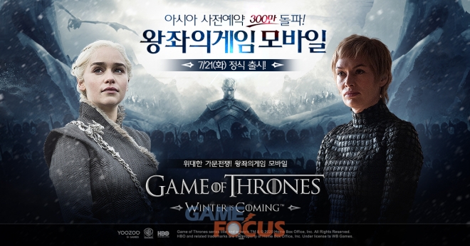 유주게임즈코리아(대표 이명)가 워너브라더스 인터랙티브 엔터테인먼트 산하 HBO의 공식 라이선스를 획득해 자사가 개발하고 서비스 예정인 전쟁 전략 모바일게임 '왕좌의게임:윈터이즈커밍(GAME OF THRONES WINTER IS COMING) 아시아 사전예약자가 300만 명을 달성했다.