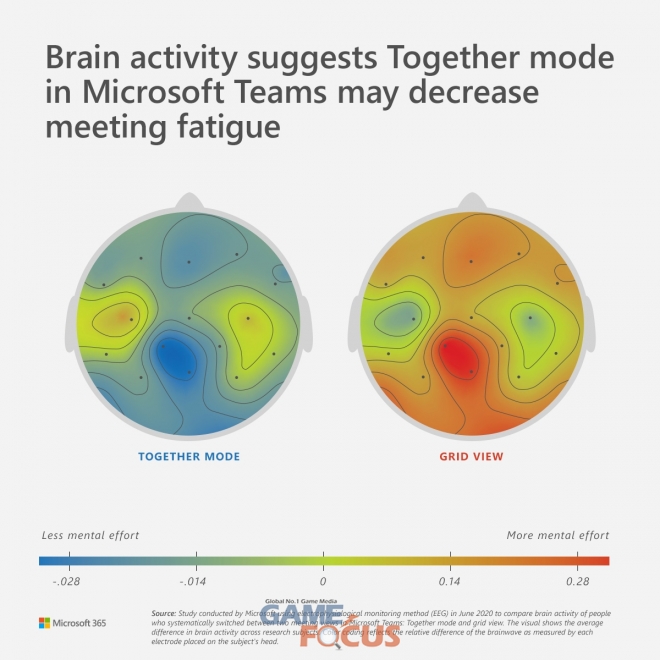 이번에 새롭게 공개된 팀즈 투게더 모드(Together mode)는 이러한 피로감을 낮출 수 있도록 지원한다. 뇌 활동을 측정하는 바이오센서 연구 기반으로 구현된 투게더 모드는 참가자들을 공유된 가상 공간에 배치하여 함께 있는 느낌을 준다. 또한 끄덕거림 등과 같은 비언어적 행동을 쉽게 인지할 수 있도록 도와 뇌의 에너지 소모량을 줄여준다. 또 다른 기능인 다이내믹 뷰 (Dynamic view)는 사용자의 선호도와 필요에 따라 화면을 조정할 수 있다.
