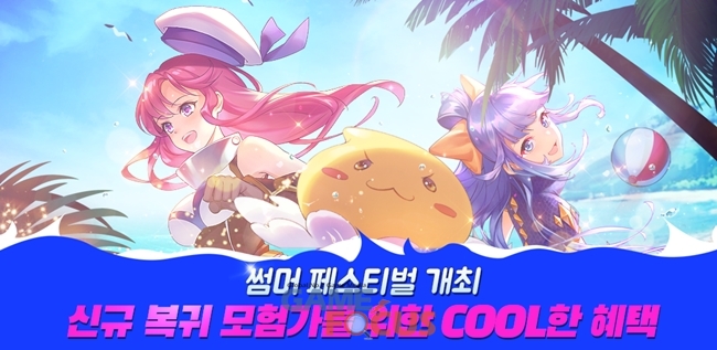 이번 프로모션은 본격적인 여름을 맞이해 기존 유저들은 물론, 신규 유저 및 복귀 유저들에게 다양한 보상과 혜택을 제공하고자 총 4가지 이벤트로 구성했다. 먼저 7월 14일 오후 2시부터 8월 18일까지 '여름 축제 입장 선물' 이벤트를 진행해 3회에 걸쳐 특별 시크릿 쿠폰을 공개한다. 1회차에는 '카드 도감 해제권: 파랑', 2회차에는 '축제 마스코트 도면', 3회차에는 '한설 무기 의상 교환권' 등을 지급한다.