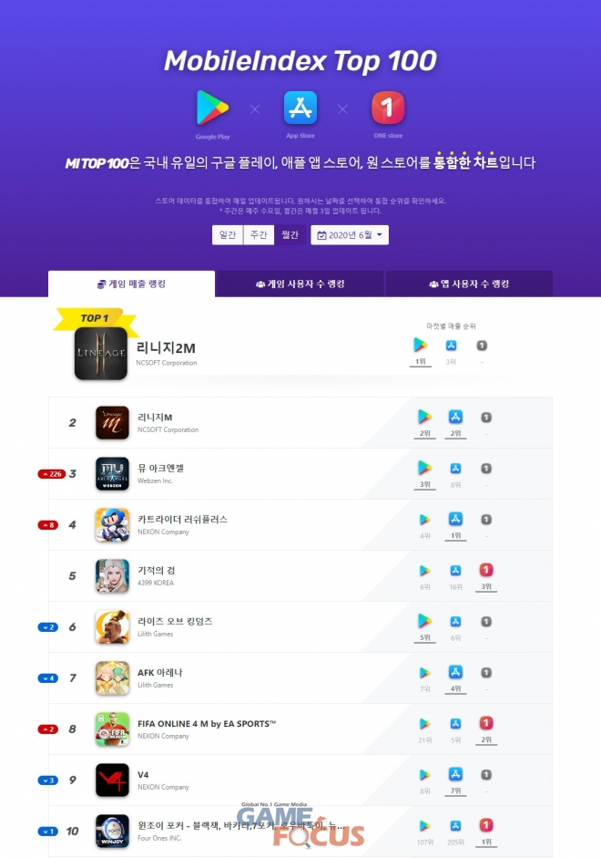 모바일인덱스가 게임 매출을 기준으로 한 6월 모바일 게임 통합 랭킹 차트를 발표했다.