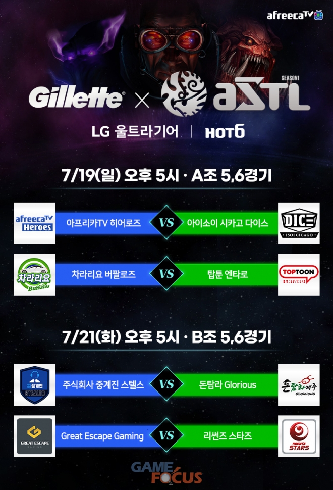 아프리카TV가 19일(일)과 21일(화) 양일간 서울 잠실 롯데월드 내 '핫식스 아프리카 콜로세움' 경기장에서 '스타크래프트 : 리마스터(StarCraft®: Remastered)'로 진행되는 '질레트 아프리카TV 스타크래프트 팀 리그(이하 질레트 ASTL) 시즌1'의 4주차를 진행한다. 이번 4주차 경기를 마지막으로 조별 풀리그가 종료되며, 4강 싱글 토너먼트에 진출할 4개 팀이 결정된다.
