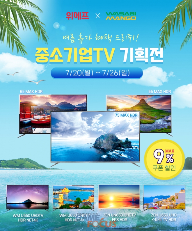 브랜드 런칭 7주년을 맞이하는 (주)와사비망고(대표이사 김환준)가 위메프에서 진행하는 '중소TV 기획전'에 참여하여, 현재 와사비망고에서 가장 좋은 반응을 얻고 있는7종의 TV를 제품 가격을 할인해 선보인다. 이와 함께 사은품을 지급하는 특별 이벤트를 진행한다.
