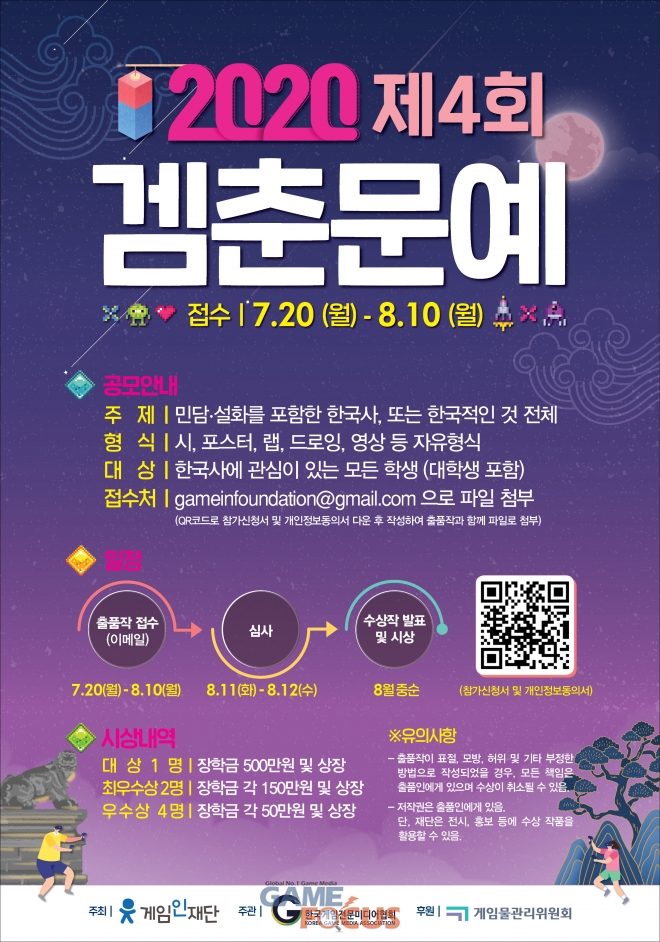 재단법인 게임인재단(이사장 남궁 훈)이 주최하고 한국게임전문미디어협회(회장 이택수)가 주관하며 게임물관리위원회(위원장 이재홍)가 후원하는 ‘2020 겜춘문예’가 접수를 시작하는 것.