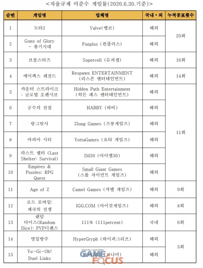 한국게임정책자율기구(이하 ‘기구’)는 한국게임산업협회(이하 ‘협회’)에서 시행하고 있는 강화된 '건강한 게임문화 조성을 위한 자율규제 강령(이하 ‘강령’)'에 따라 미준수 게임물을 2020년 7월 20일 20차 공표하였다.