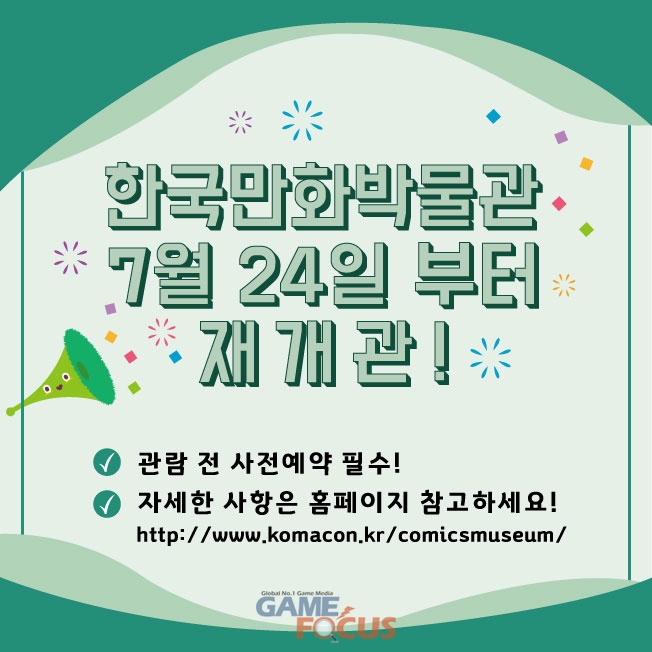 코로나19 확산 방지를 위해 지난 2월부터 휴관했던 한국만화박물관이 코로나19에 대한 방역 대비를 철저히 하고 약 5개월 만에 7월 24일(금) 재개관한다.