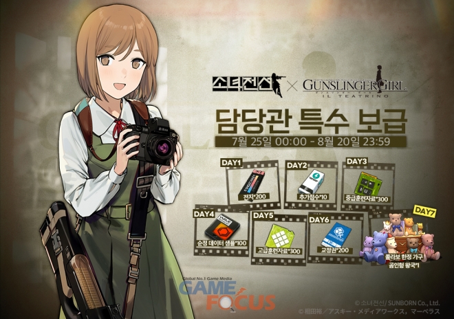 또한 '소녀전선'X'건슬링거 걸' 콜라보 이벤트 기념으로 '소녀전선'은 7월 25일부터 8월 20일까지 컬래버레이션 한정 가구 ‘곰인형 왕국'을 포함한 다양한 보상을 획득할 수 있는 7일 출석 이벤트를 진행한다.