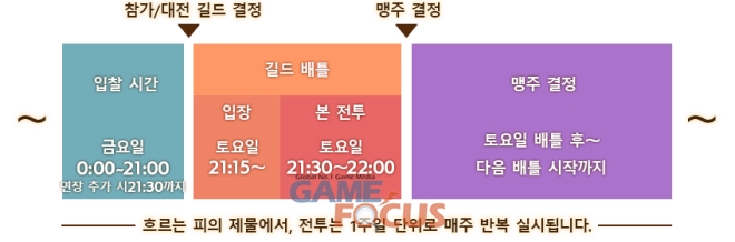 제 1회 길드전에 참가하려면 개최 전날 8월 14일(금) 0:00~21:00의 '입찰 기간' 내에 입찰을 완료해야 한다. 이를 통해 대전할 상대 길드가 결정되며, 다음 날인 8월 15일(토) 21:30부터 본 전투가 시작된다. 승리한 길드는 다음 개최까지 해당 피의 제물의 맹주가 되며, 매일 특별한 보상을 획득할 수 있음은 물론 맹주 전용 칭호나 맹주 상점도 사용할 수 있게 된다.