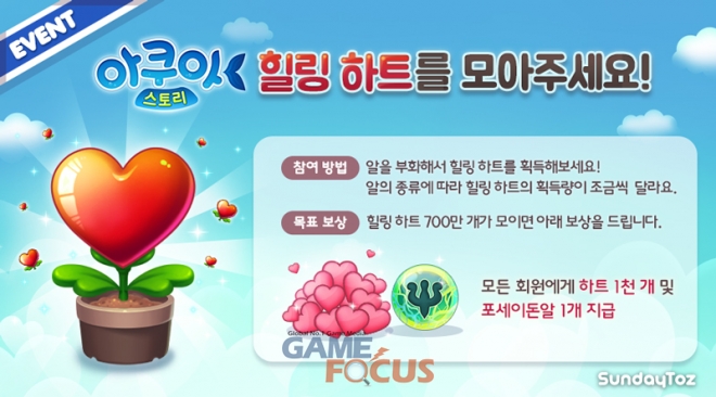 이번 이벤트는 '아쿠아스토리' 이용자들이 자신의 수조에서 힐링 하트를 만들어 누적 700만 개를 모으는 행사다. 힐링 하트 수집 개수가 목표에 도달하면 선데이토즈는 저소득 가정의 안면장애 아동들의 수술 비용을 후원하게 된다. 또한 힐링 하트 수집 목표가 달성되면 게임 이용자들에게 게임에서 사용하는 하트 1천 개와 포세이돈 알을 선물하는 이번 행사는 이용자 참여형 행사의 의미를 더할 것으로 관심을 모은다.
