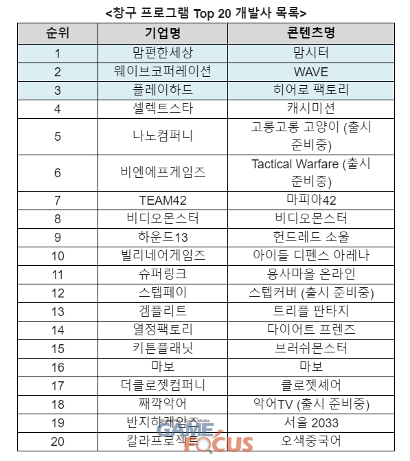 창구 프로그램 시즌 2에는 액션 및 전략, 시뮬레이션 게임부터 육아, 동영상 편집, 라이프스타일, 소셜 앱에 이르는 다양한 개발사가 지원했으며, 1차 서류평가와 2차 발표평가를 거쳐 100개의 개발사가 선정됐다. 이 중 뛰어난 혁신성과 차별화된 경쟁력으로 호평을 받은 ▲맘시터(맘편한세상) ▲웨이브(웨이브코퍼레이션) ▲히어로 팩토리(플레이하드)가 Top 3의 영예를 안았다.