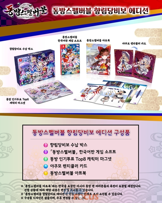 동방스펠버블 한국어판의 패키지는 일반판을 비롯하여 '동방스펠버블 향림당비보 에디션'과 '동방스펠버블 향림당비보 밤연회 스페셜 에디션'의 3종류로 출시된다.