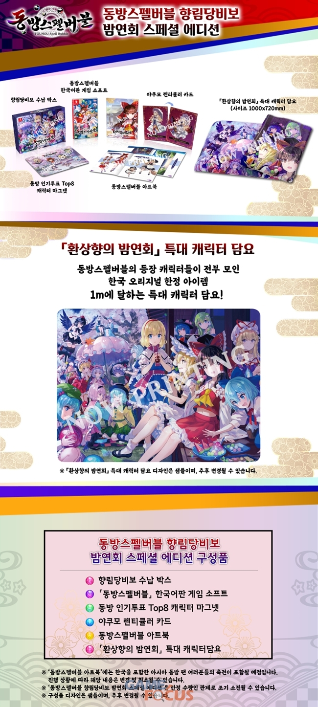 동방스펠버블 향림당비보 밤연회 스페셜 에디션에는 한국어판 게임 소프트와 '향림당비보 수납 박스', 동방스펠버블의 한국어 패키지판 출시 결정 기념 캐릭터 인기투표에서 상위 TOP8을 차지한 캐릭터의 SD일러스트로 구성된 '동방 인기투표Top8 캐릭터 마그넷', 인기투표에서 1위를 차지한 '야쿠모 유카리'의 일러스트를 테마로 한 '야쿠모 렌티큘러 카드', 게임에서 사용된 캐릭터 일러스트와 아트워크가 포함된 아트북, 그리고 동방스펠버블의 캐릭터들이 한데 모인 일러스트로 장식된 '환상향의 밤 특대 캐릭터 담요'가 동봉된다.