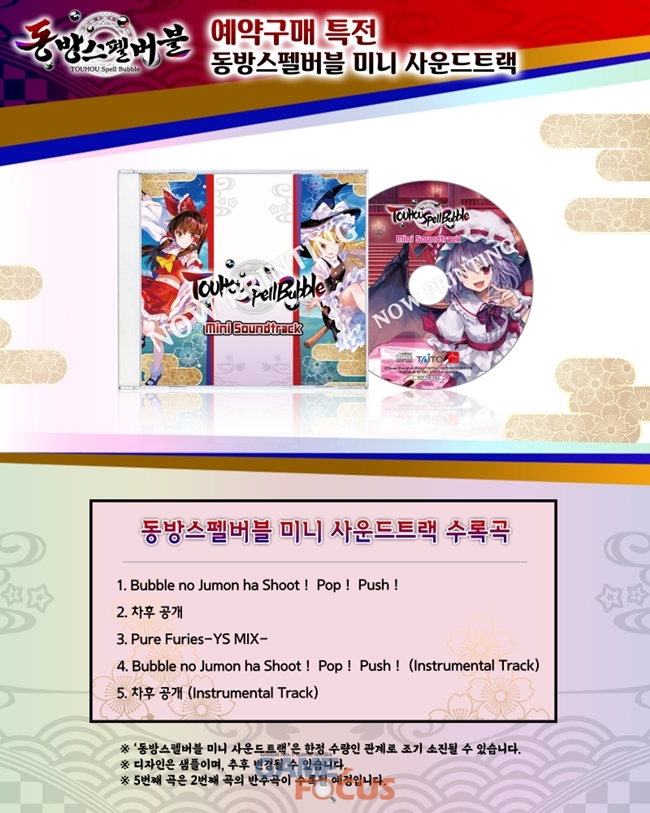 또 한국어 패키지판을 예약 구매하면 공통 예약 특전으로 동방스펠버블에서 사용된 오리지널 동방 어레인지 악곡을 포함하여 총 5곡(3곡+Instrumental Track 2곡)이 수록된 '동방스펠버블 미니 사운드트랙'이 증정된다.