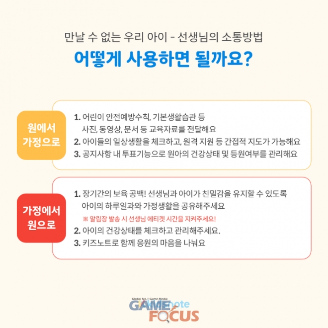 앞서 보건복지부는 지난달 30일부터 수도권 어린이집 휴원을 발표하였으며, 교육부도 8월 26일~9월 11일 사이 수도권 유치원의 전격적인 원격수업을 발표하였다. 이에 따라 기존 병행되던 긴급보육 서비스도 최소 규모로 운영하게 된다. 수도권 어린이집, 유치원이 전면적인 휴원 및 원격수업 체제로 전환됨에 따라 원격수업에 대한 출결확인은 물론, 아이의 체온 확인, 가정으로의 교육자료 전달 등 쌍방 피드백을 받을 수 있는 온라인 소통과 원격 수업 수단이 절실해진 상황이다.
