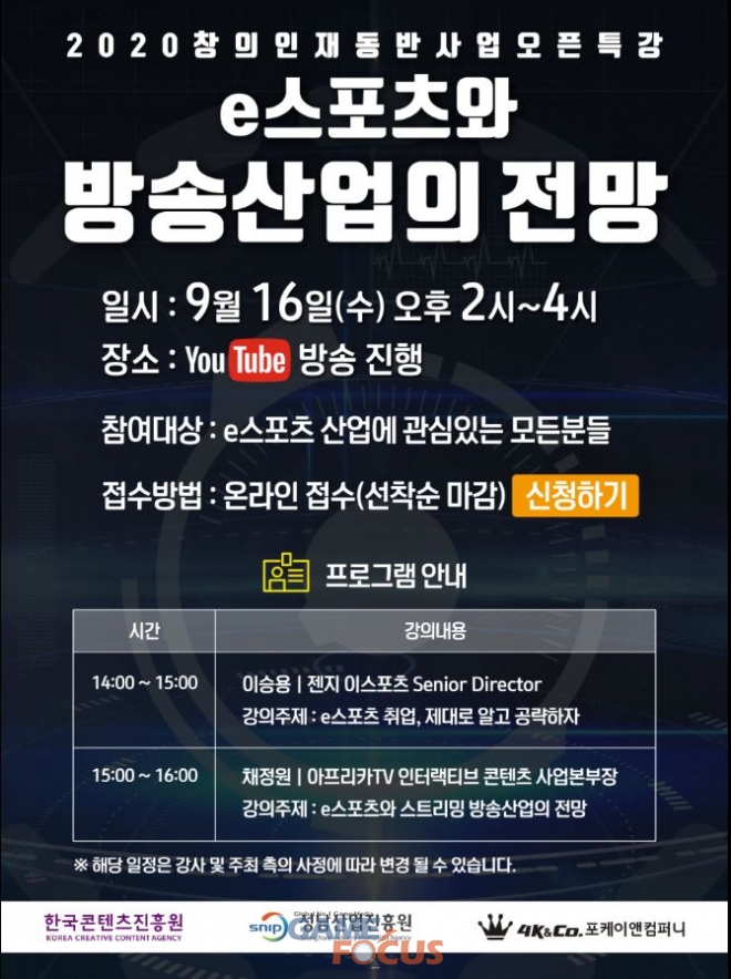 포케이앤컴퍼니 14일, 성남산업진흥원과 9월 16일 콘텐츠 창의인재동반사업 프로그램의 일환으로 ‘e스포츠와 스트리밍 방송산업의 전망’이라는 주제로 오픈특강을 개최한다고 밝혔다. 한국콘텐츠진흥원(원장 김영준)의 지원사업인 '2020 콘텐츠 창의인재동반사업'의 플랫폼기관으로 선정된 성남산업진흥원이 주관하는 이번 특강은 코로나19의 확산으로 인해 온라인 실시간 시청 참여로 진행될 예정이다.