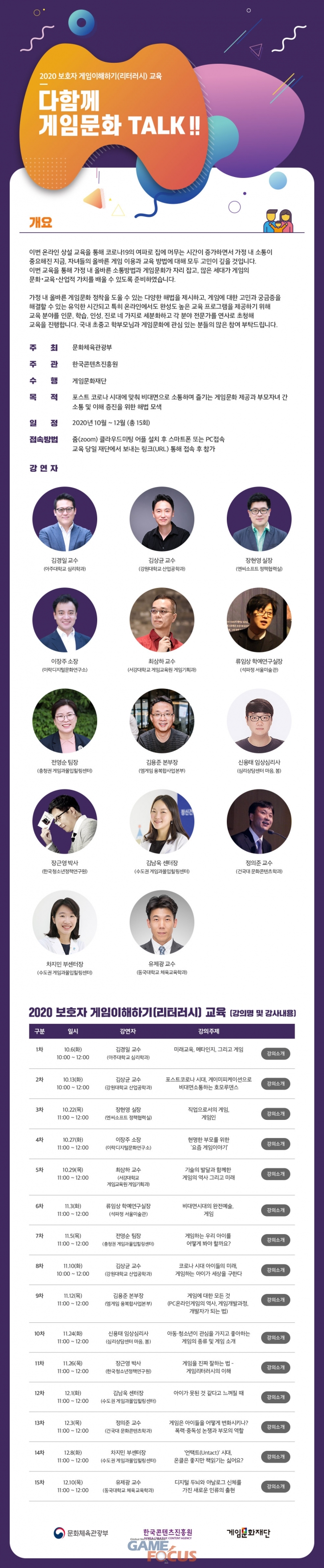 ‘2020 보호자 게임이해하기(리터러시) 교육-다함께 게임문화 TALK!!’은 10월 6일(화) 첫 강연을 시작으로 12월까지 주 2회씩 15회에 걸쳐 온라인으로 진행된다.