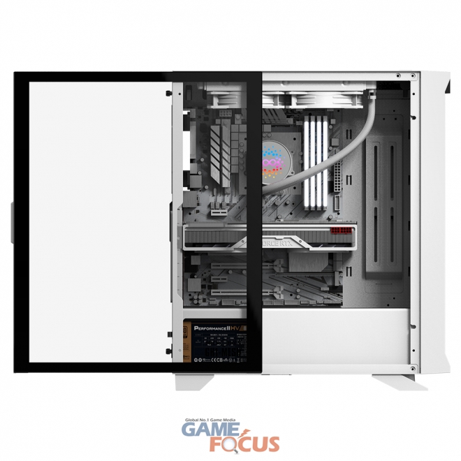 케이스 측면은 4T 수준의 프리미엄 강화유리를 통해 화려한 내부 시스템을 감상할 수 있다. 특히 강화유리는 이동이 손쉬운 슬라이딩 방식을 채택했으며, 하단에 마련된 레일을 통해 강화유리를 보다 안전하게 탈부착이 가능하도록 설계했다. PCI 슬롯의 경우 총 4개로 구성되어 있으며 가이드는 재사용이 가능하도록 설계되어 있다.