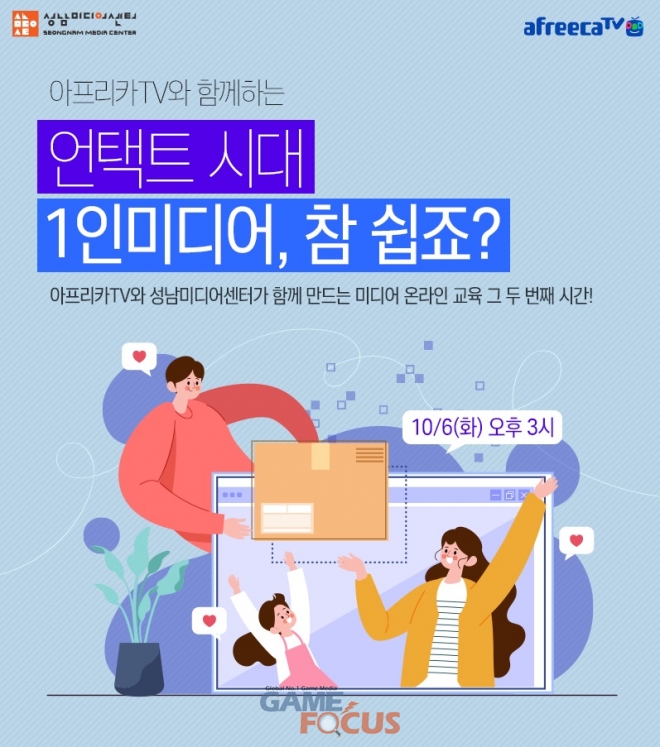 아프리카TV는 6일(화) 성남미디어센터와 함께 1인 미디어 교육 프로그램 '언택트 시대, 1인 미디어 참 쉽죠'를 진행한다고 밝혔다. 이번 프로그램은 신종 코로나바이러스 감염증(코로나19)으로 인해 비대면 콘텐츠가 증가하는 상황에 맞춰 온라인으로 방송하는 법을 알려주기 위해 마련됐다.