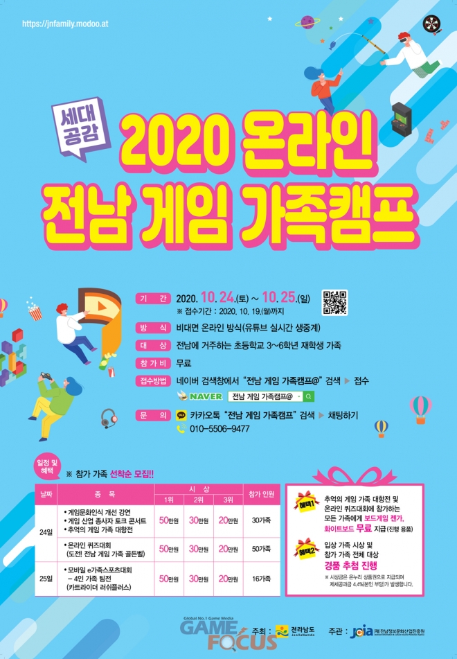 행사 관련 문의 사항은 카카오톡에서 '전남 게임 가족캠프'를 검색, 채팅하기 기능이나 전화로 연락하면 된다.