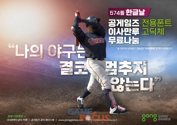 이와 함께 574돌 한글날을 기념하여 공게임즈가 직접 디자인하고 개발한 전용서체인 '이사만루체'의 무료 배포를 실시한다. '이사만루체'는 공게임즈가 가지고 있는 아이덴티티를 비롯해 야구 스포츠와 게임 콘텐츠가 가지고 있는 역동성과 속도감을 강조한 특징을 가지고 있다.