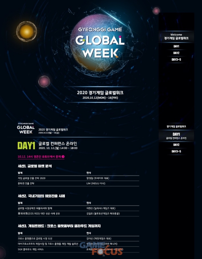 이번 행사는 COVID19로 인해 온라인과 비대면 방식으로 진행되며, 첫날 글로벌 컨퍼런스를 시작으로 다음날은 ‘새로운 경기 게임 오디션’ 최종오디션이, 그리고 다음 3일 간은 ‘온라인 수출상담회’ 가 진행된다.