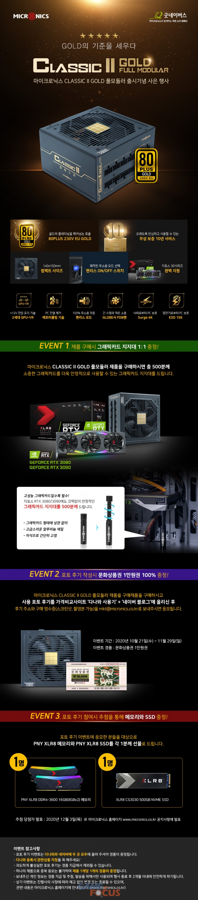 두 번째는 포토 후기 작성 이벤트다. 제품을 구매한 후 가격비교사이트 다나와와 네이버 블로그에 사용 포토 후기를 작성, 관련 내용과 촬영한 구매 영수증을 마이크로닉스에 전달하면 문화상품권 1만원을 제공한다. 또한, 후기 이벤트에 응모한 참가자를 대상으로 추첨을 통해 총 두 명에게 PNY XLR8 DDR4-3600 16GB 키트 또는 XLR8 CS3030 500GB NVMe SSD를 증정한다.