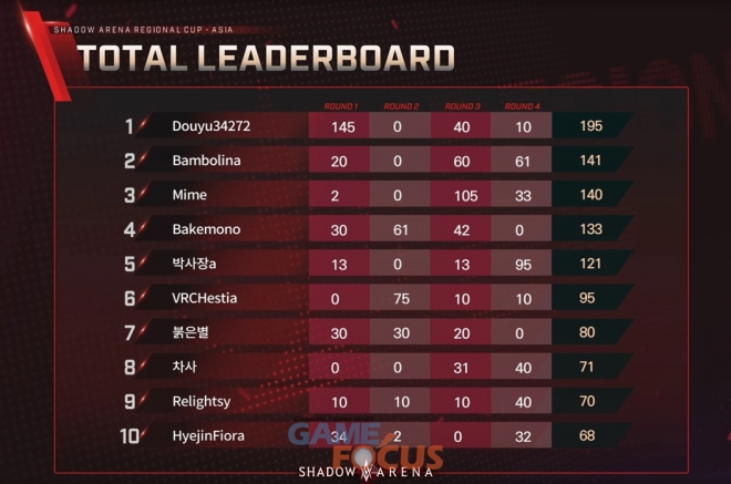 섀도우 아레나 리저널컵은 총 상금 1,000만 원을 걸고 진행되는 PvP 대회다. 총 4라운드 동안 생존 점수, 플레이어 킬 점수를 종합해 순위를 결정한다. 리저널컵 10월 대회는 10월 13일과 14일 조별 예선, 10월 18일 결승전 일정으로 진행됐다. 결승전은 예선전 성격인 트라이아웃(Tryout) 대회 우승자와 조별 예선을 통해 선발된 선수까지 총 40명이 참여했다.
